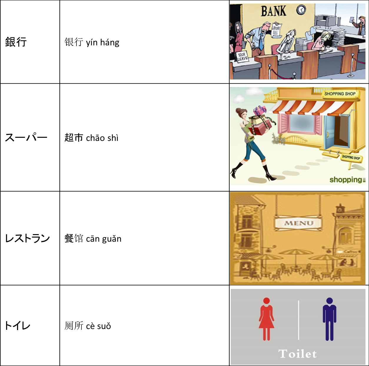 まいにち、単語をおぼえましょう第六弾 未選択 2013年08月15日 0 今日は場所に関する単語をみなさんにちょっと紹介したいんです。 覚えましたか。あおい中国語教室 021-62455501あおい中国語