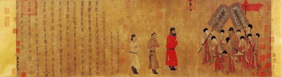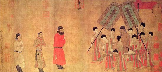 閻立本『歩輦図』 未選択 2013年08月16日 0 作者:阎立本作者:閻立本尺寸:纵38.5厘米,横129.6厘米寸法:縦38.5cm、横129.6cm材质:绢本、设色材質:絹・色付け年代:唐(现藏北京故宫博物院)年代:唐(現在、北京故宮博物院で所蔵)《步辇图》是故宫博物院中国十大传世名画之一,设色典雅绚丽,线条流畅圆劲,构图错落富有变化,为唐代绘画的代表性作品,具有珍贵的历史和艺术价值。『歩輦図』は故宮博物院の中国十大名画のひとつである。格調高くきらびやかな色使いで、線はなめらかで、巧みな構造で変化に富んでおり、唐代絵画の代表的作品として、歴史的・芸術的に貴重な価値がある。《步辇图》是反映的是吐蕃(西藏)王松赞干布迎娶文成公主入藏的事。图卷右半是在宫女簇拥下坐在步辇中的唐太宗,左侧三人前为典礼官,中为禄东赞,后为通译者。画中的唐太宗面目俊朗,目光深邃,神情庄重,充分展露出盛唐一代明君的风范与威仪。『歩輦図』は、吐蕃(チベット)王ソンツェン・ガンボが文成公主のチベット嫁入りを迎える場面を表した図である。図の右半分は宮女が座して輦に乗っている唐太宗を取り囲んでおり、左側の三人は、前から儀礼官、禄東賛、通訳である。画の中の唐太宗は見目麗しく、深邃な目をしていて厳粛な表情であり、唐が栄えた時期の明君の風格と威厳に満ちている。从绘画艺术角度看,作者的表现技巧已相当纯熟。衣纹器物的勾勒圆转流畅中带有坚韧;主要人物的神情举止栩栩如生;图像局部配以晕染,如人物所穿靴筒的折皱等处,显得极具立体感;全卷设色浓重淳净,大面积红绿色块交错安排,富于韵律感和鲜明的视觉效果。絵画を芸術面から観察すると、作者の表現技巧は相当習熟していると言える。衣類や器物の輪郭はなめらかだがしなやかさがあり、主な人物の挙措はいきいきとしていて、図の局部には部分的な色付けがほどこされている。たとえば人物が履いている靴のしわなどにその技巧が使われており、立体感に満ちている。全巻の色付けは濃厚で混じりけがなく、大部分が赤と緑とを交差させた色使いになっており、リズム感とあざやかな視覚効果に富んでいる。阎立本简介閻立本略歴阎立本(601~673年),隋代画家阎毗之子,阎立德之弟。唐太宗时任刑部侍郎,后做工部尚书、右丞相。閻立本(601~673年)は、随代の画家閻毗の子であり、閻立徳の弟である。唐太宗の時に刑部侍郎を務め、のちに工部尚書・右丞相を務めた。他的书画取材广泛,如宗教人物、车马、山水等,尤其擅长画人物肖像。《步辇图》是以贞观十五年(641年)吐蕃首领松赞干布与文成公主联姻的历史事件为题材,描绘唐太宗接见来迎娶文成公主的吐蕃使臣禄东赞的情景。彼の書画は題材が豊富である。たとえば宗教人物・馬車・山水などを描いでおり、特に人物肖像画を描くのに長けていた。『歩輦図』は貞観十五年(641年)、吐蕃の首長ソンツェン・ガンボと文成公主の婚姻という歴史的な出来事を題材にしたものであり、吐蕃の使いである禄東賛が唐太宗に接見し文成公主を迎えに来た場面を描いている。あおい中国語教室 021-62455501あおい中国語 PR